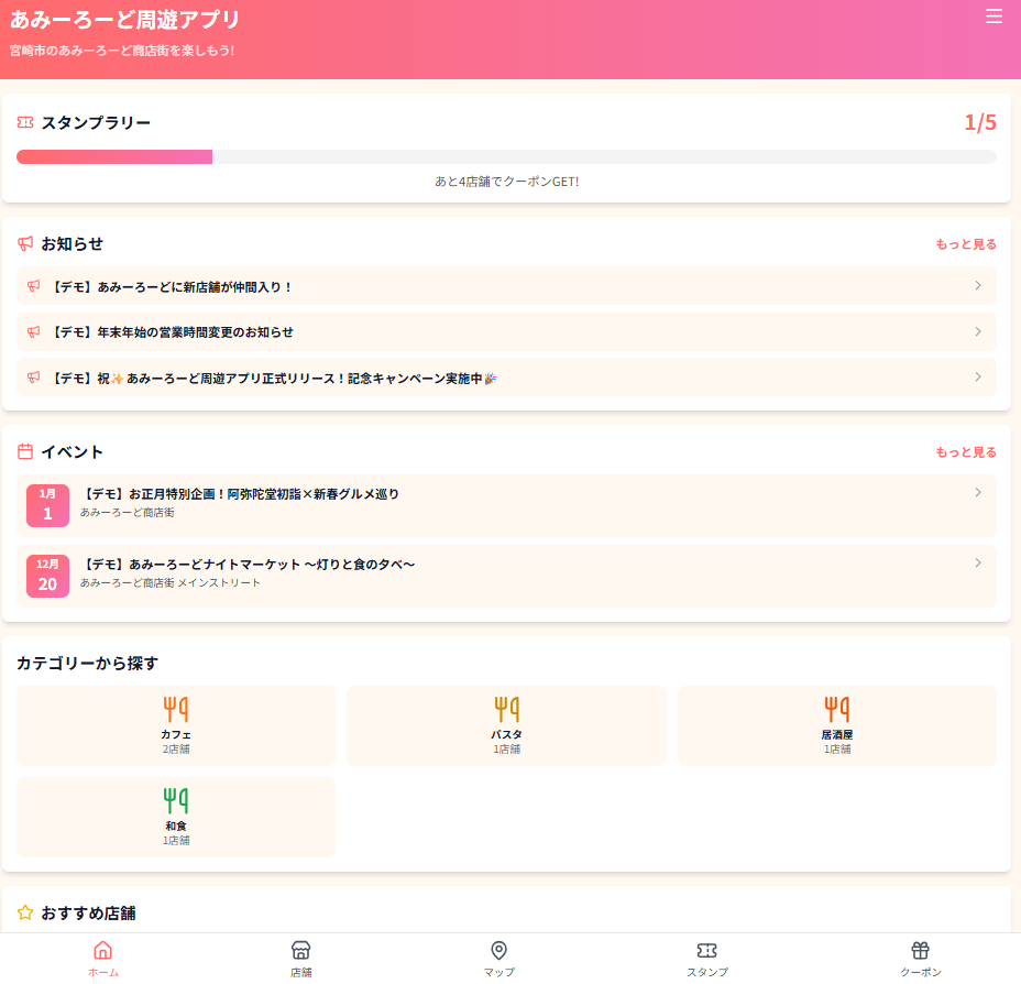 今回のアプリは実際にある商店街をモデルに作成したデモアプリですが、観光地・地域イベント・ショッピングモール・フードフェスなど、さまざまな場所への応用が可能な設計になっています。