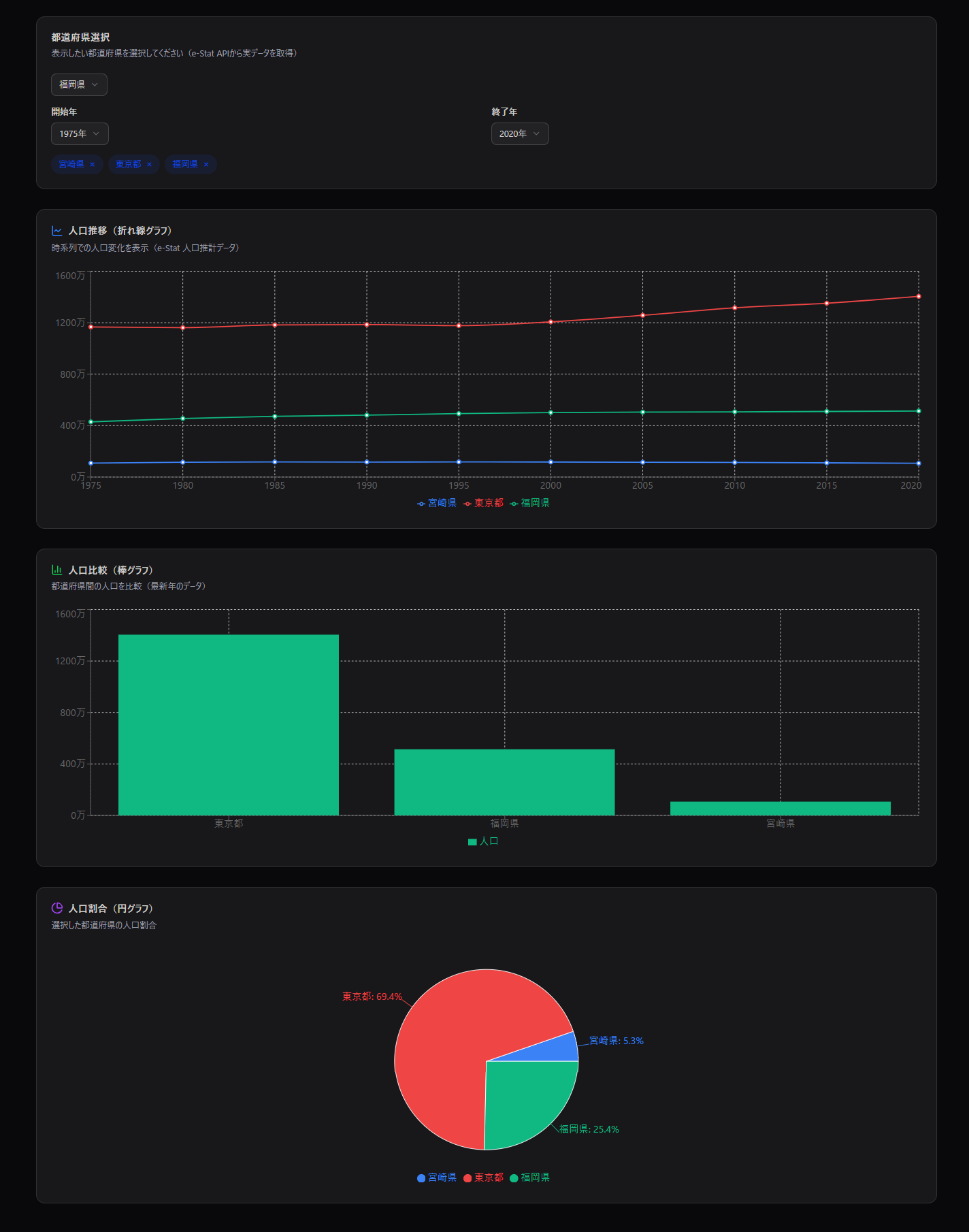 ユーザーは都道府県を選択するだけで、人口推移や地域間比較などのデータがリアルタイムで取得され、折れ線グラフ・棒グラフ・円グラフの3種類のビジュアルで確認できます。