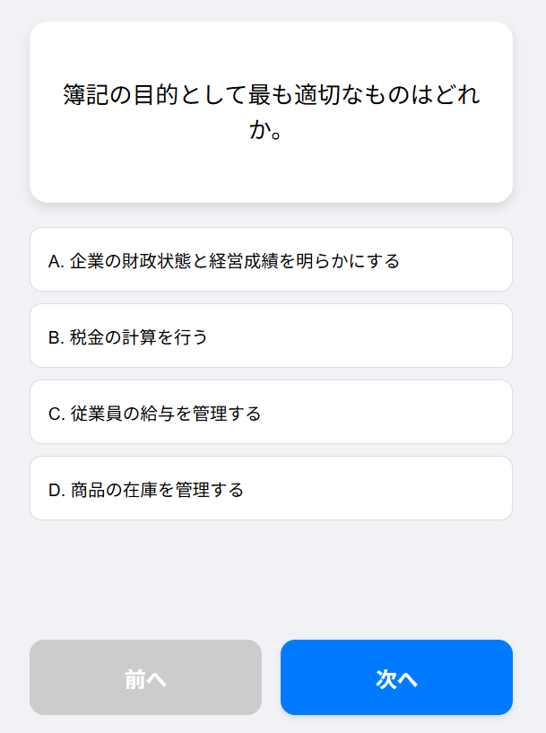 解答ボタンを押すと正答がすぐに確認できるシンプル設計で、学習のテンポを崩さずに知識を定着させられます。