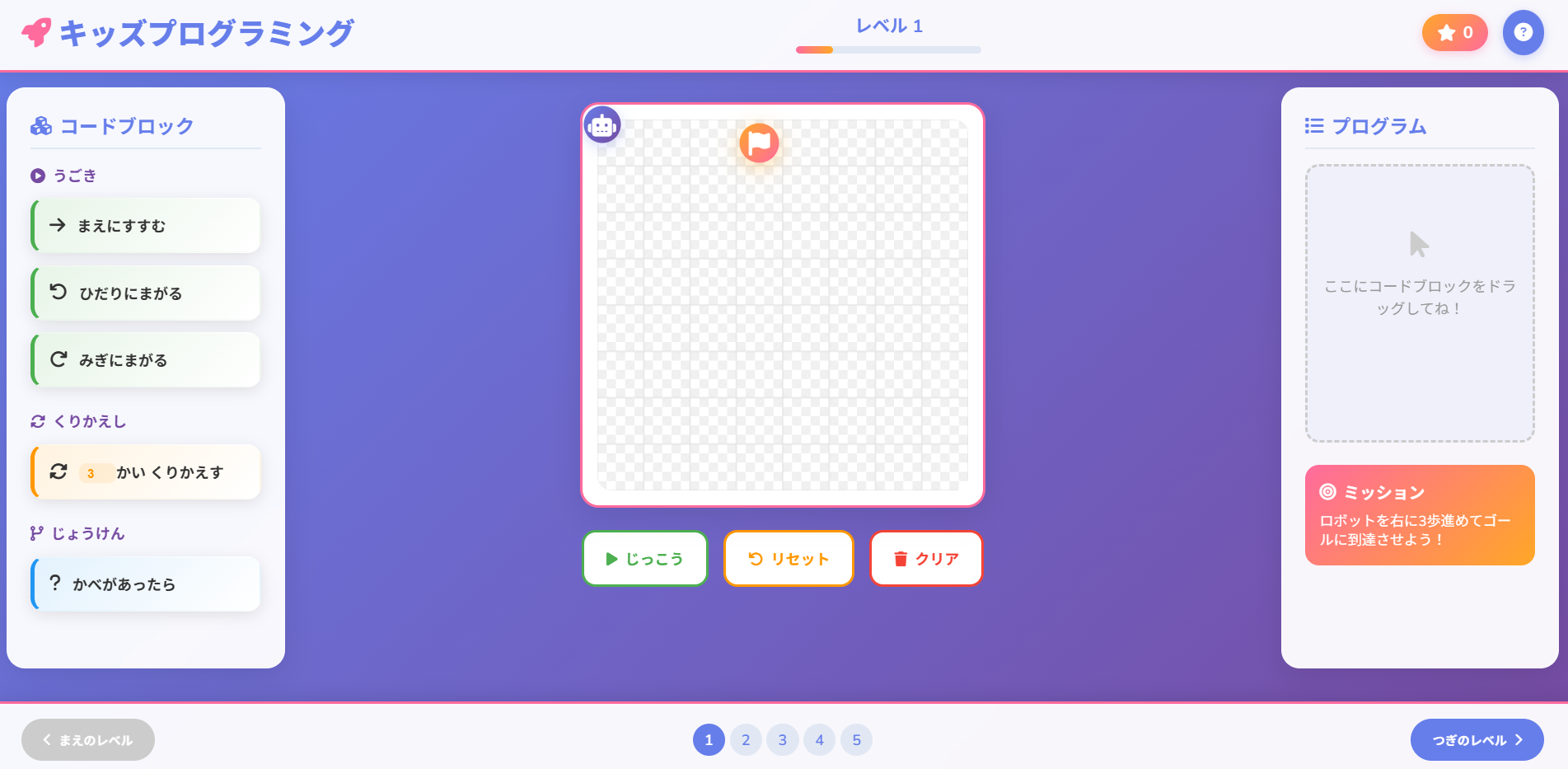 画面上のブロックをドラッグ&ドロップするだけで、ロボットに命令を出してゴールを目指すシンプルな学習ゲーム。