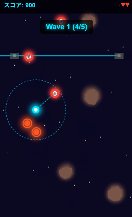 プレイヤーは自機をドラッグで操作し、周囲に発生する誘引エリアで敵を引きつけます。