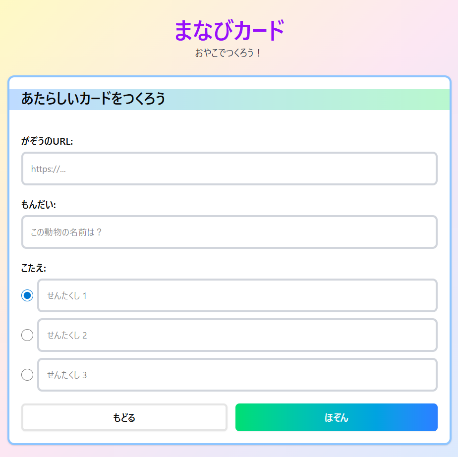 アプリの使い方はとてもシンプルで、まず画像URLを入力し、続いて問題文、そして選択肢を三つ入力するだけでカードが完成します。