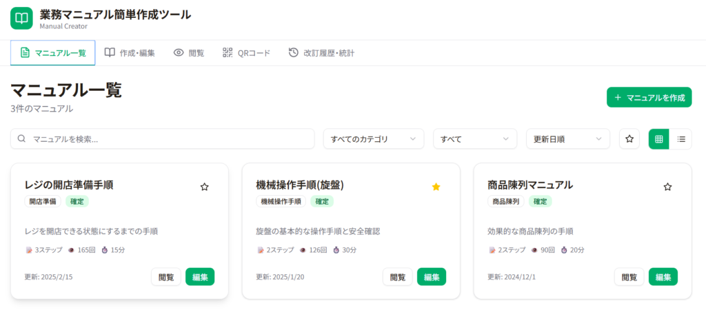 ✅一覧画面で、作成済みマニュアルをカード形式で管理