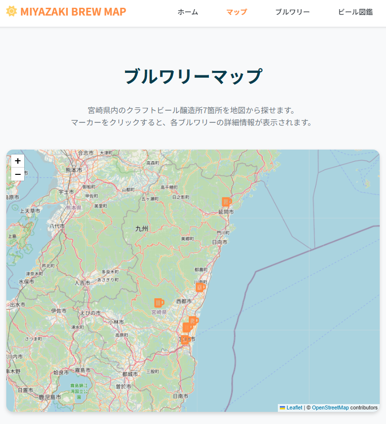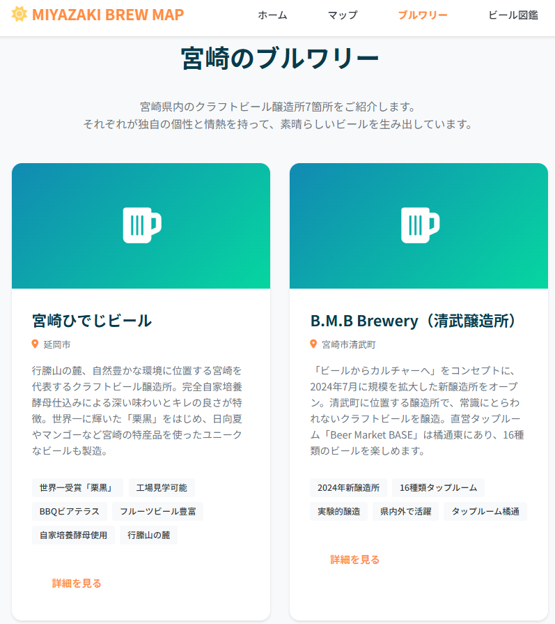 ブルワリー画面では、宮崎県内のクラフトビール醸造所7箇所をわかりやすく紹介。
