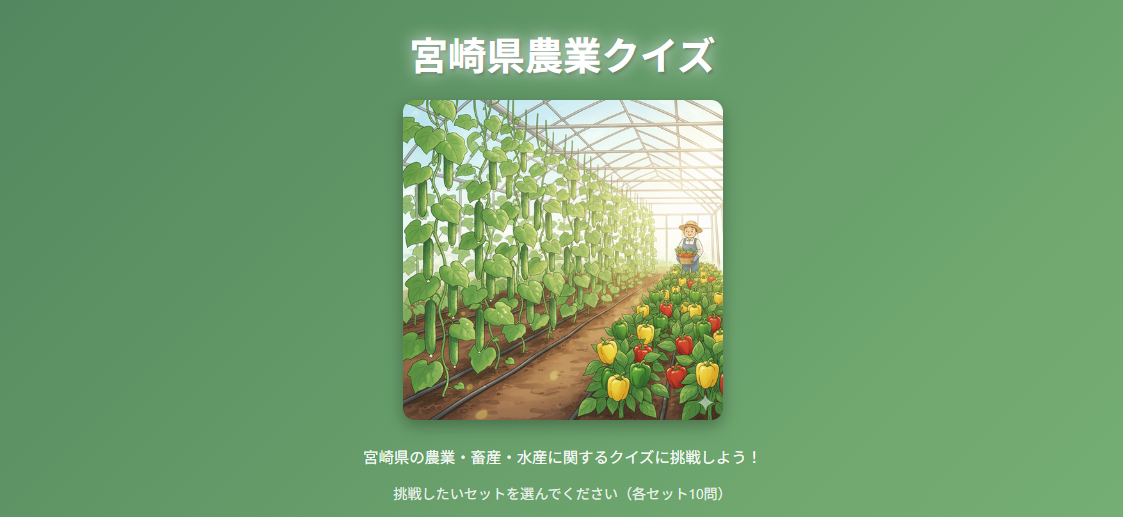 Claude+Geminiを活用して制作されたAI制作ゲーム第31弾、「宮崎県ご当地クイズ(農業ver)」が公開されました。
