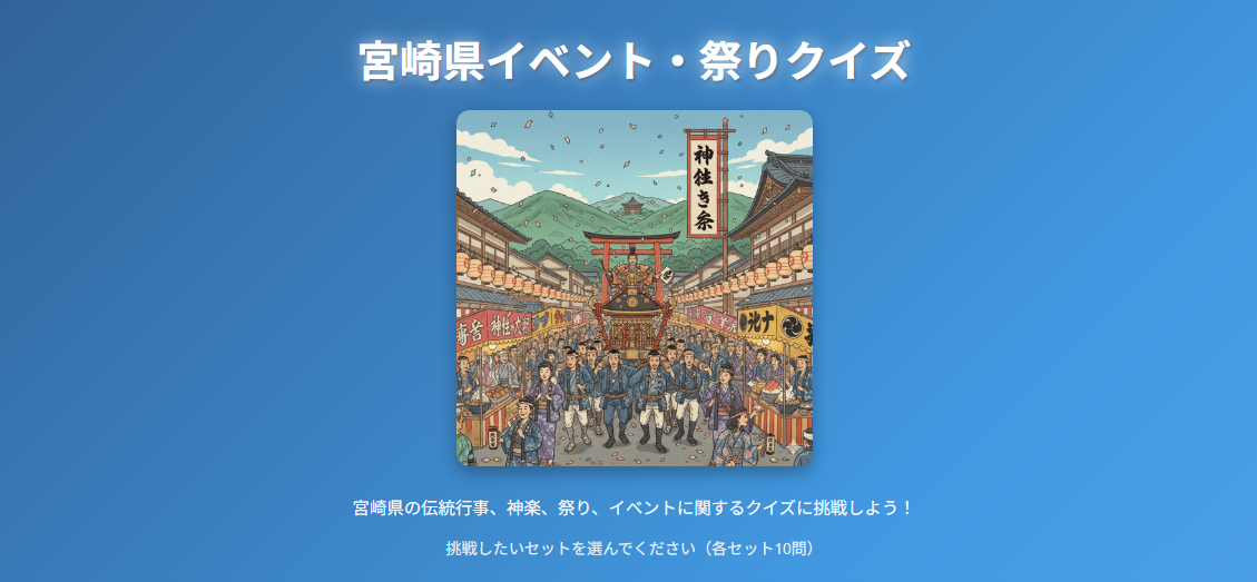 Claude+Geminiを活用して制作されたAI制作ゲーム第34弾、「宮崎県ご当地クイズ(イベント・祭りver)」が新たに登場しました。