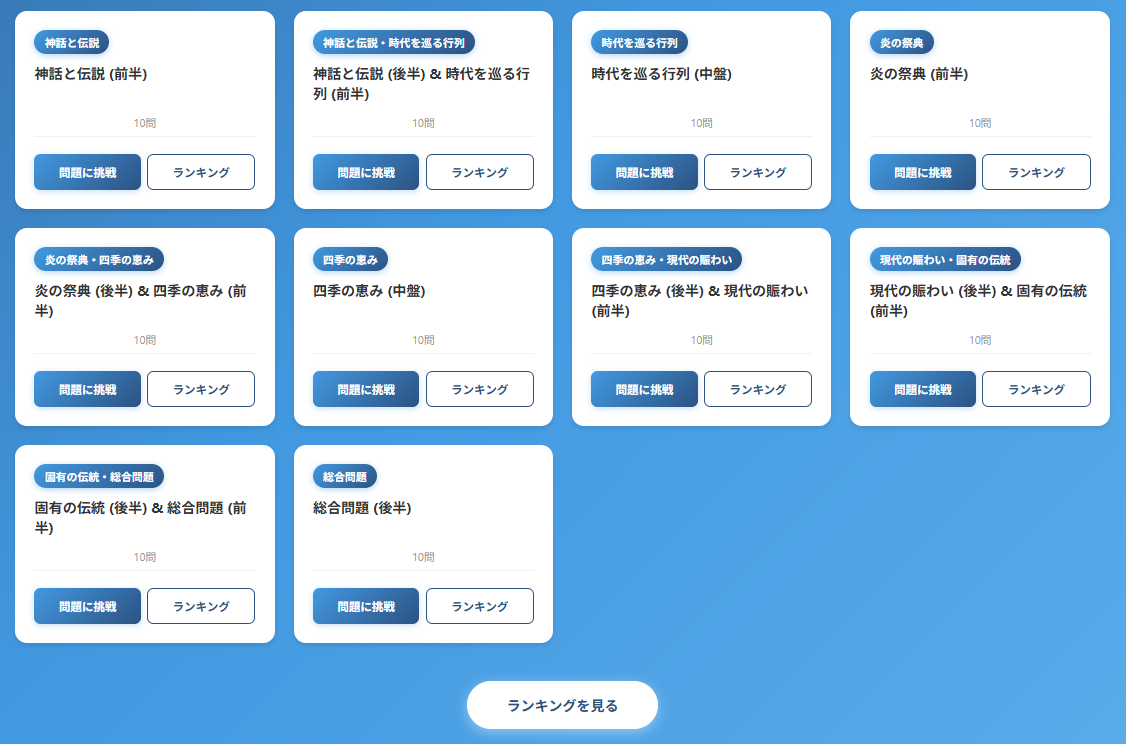 祭りの由来から地域イベントの背景まで、遊びながら知識が深まる“文化探訪クイズ”として楽しめます。