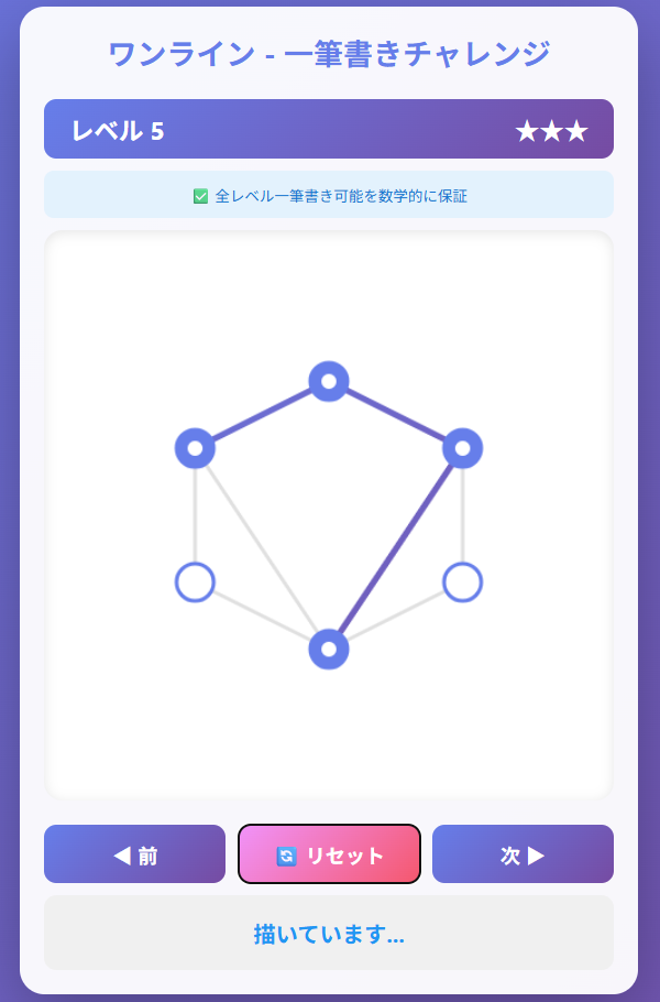 プレイヤーは表示された図形の点と線を観察し、どの順番でつなげば一筆書きが成立するかを考えながらなぞっていきます。