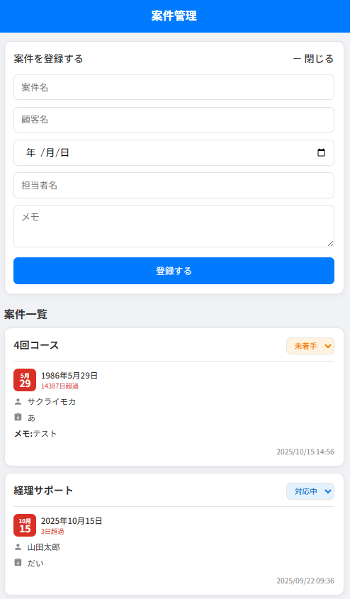 スマートフォンやPCから案件名・顧客情報・期日・担当者・メモを入力するだけで、自動的にスプレッドシートへデータを登録。