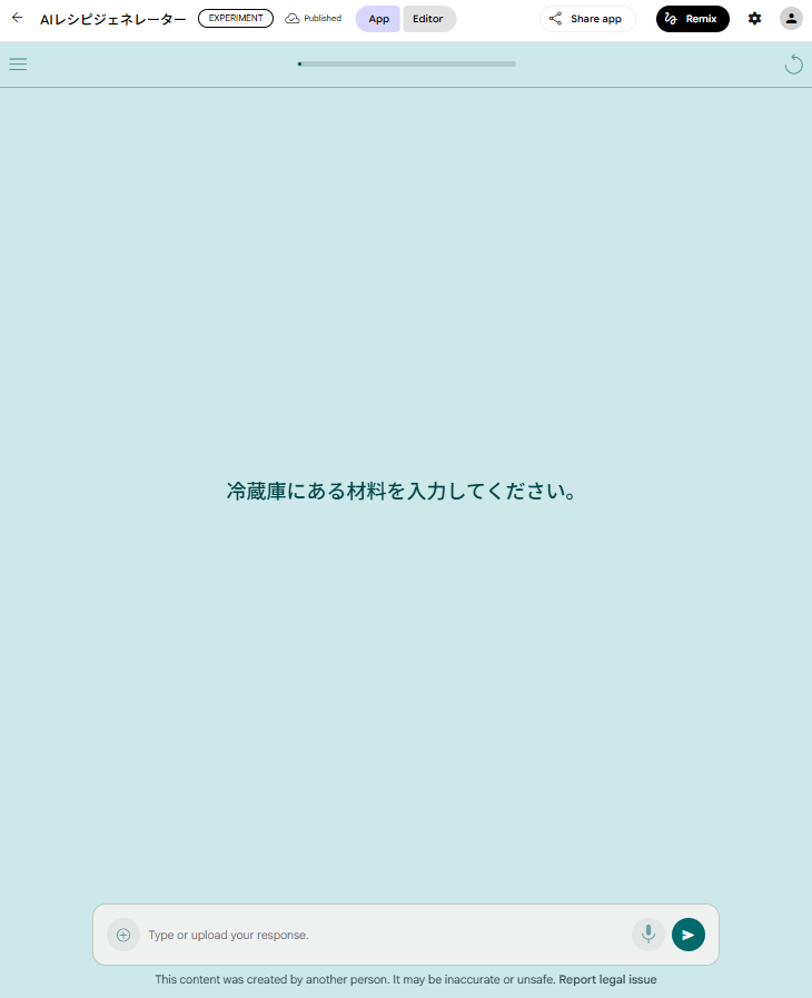 画面には「冷蔵庫にある材料を入力してください」と表示され、ユーザーが自由に食材を書き込むだけでレシピ候補が自動で作成されます。
