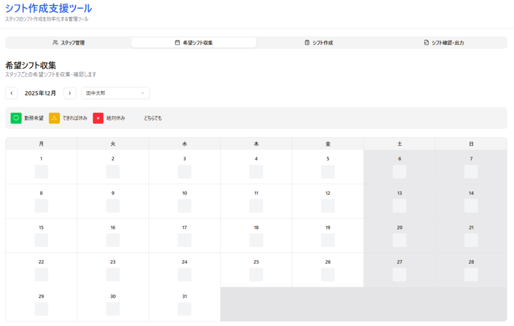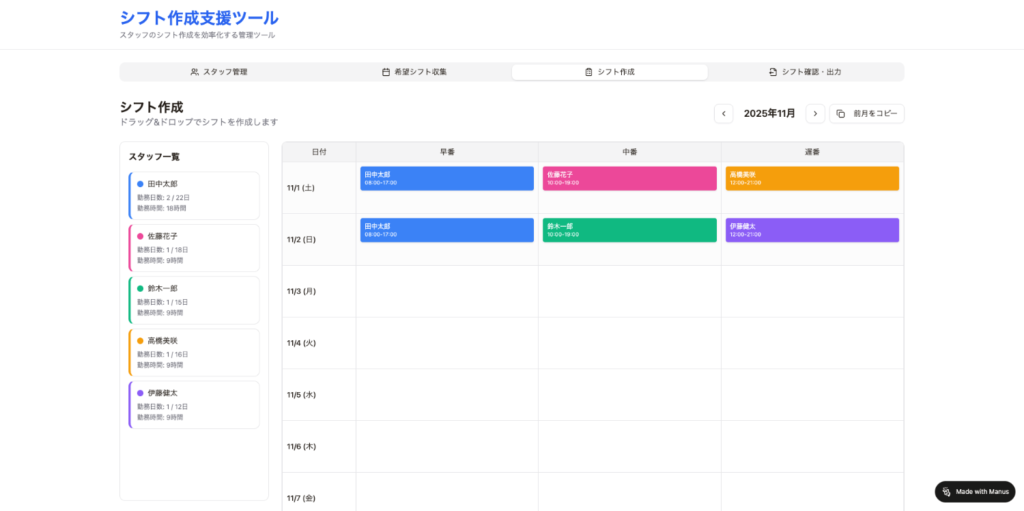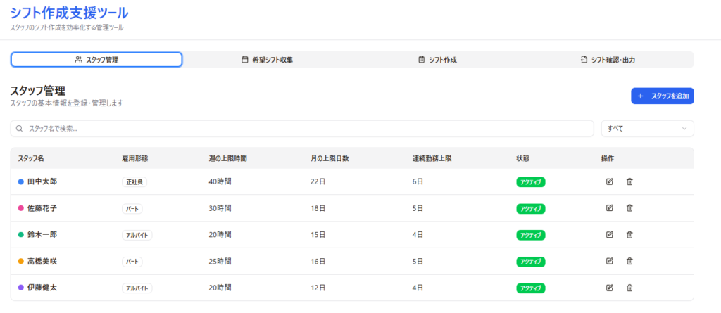 『ひなたAI研究所』が制作した本作は、現場のシフト管理を少しでも“ラクに、正確に”行えるようにとの意図で構築されたアプリです。