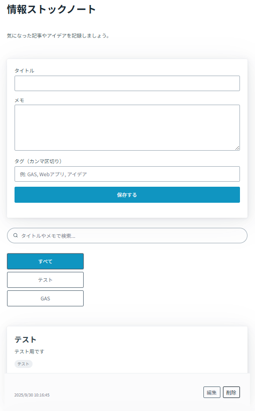 「タイトル」「メモ」「タグ」を入力して「保存」を押すだけ。