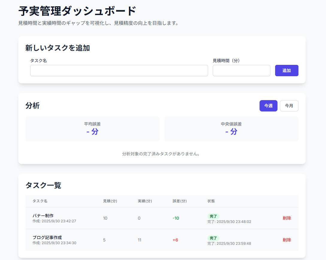 タスク一覧、平均誤差、中央値誤差などを表示するデザインも特徴。