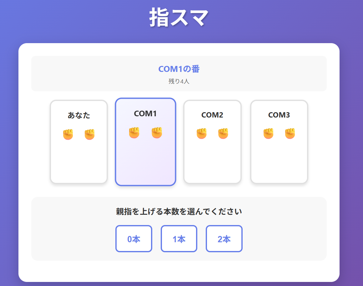 プレイヤーとCOMキャラクターが順番に指を上げ、宣言した本数と合えばそのプレイヤーが抜けていく――。